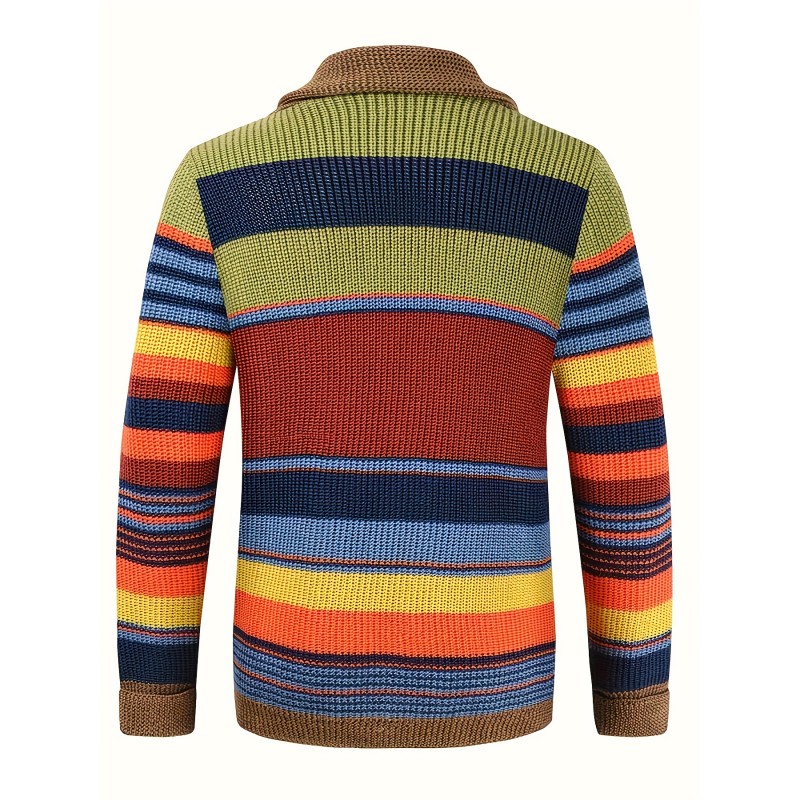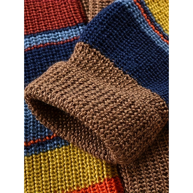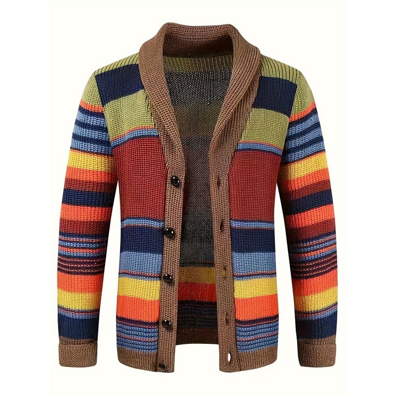 Elegant Retro Button Up Slightly Stretch Cardigan Jacket, Men's Casual Color Block Vintage Style V Neck Sweater Cardigan Coat For Fall Winter