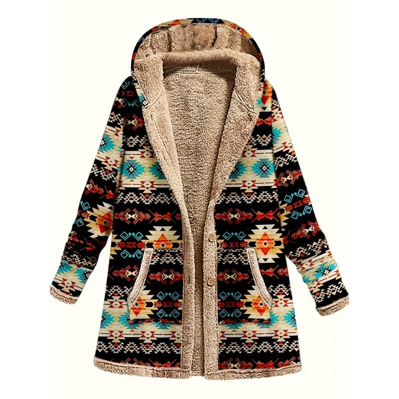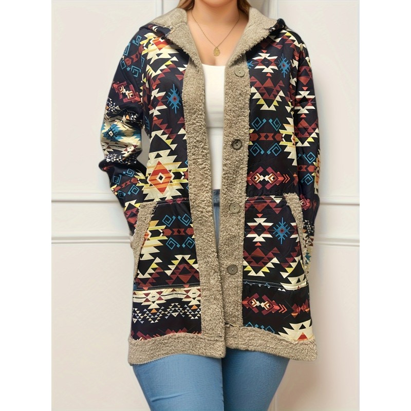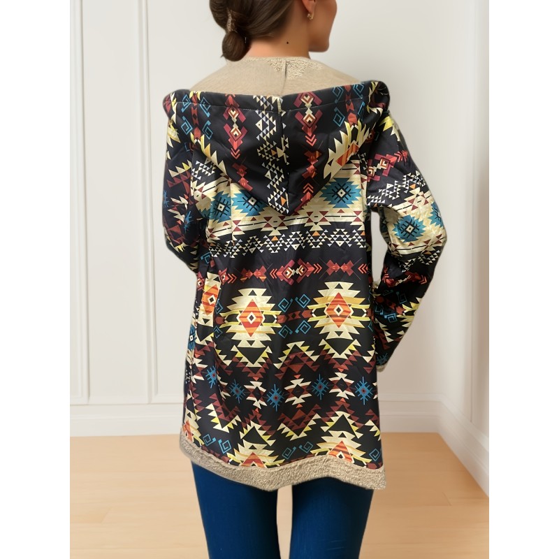 Geo Print Button Front Jacket, Casual Long Sleeve Hooded Jacket With Pockets For Fall & Winter, Women's Clothing