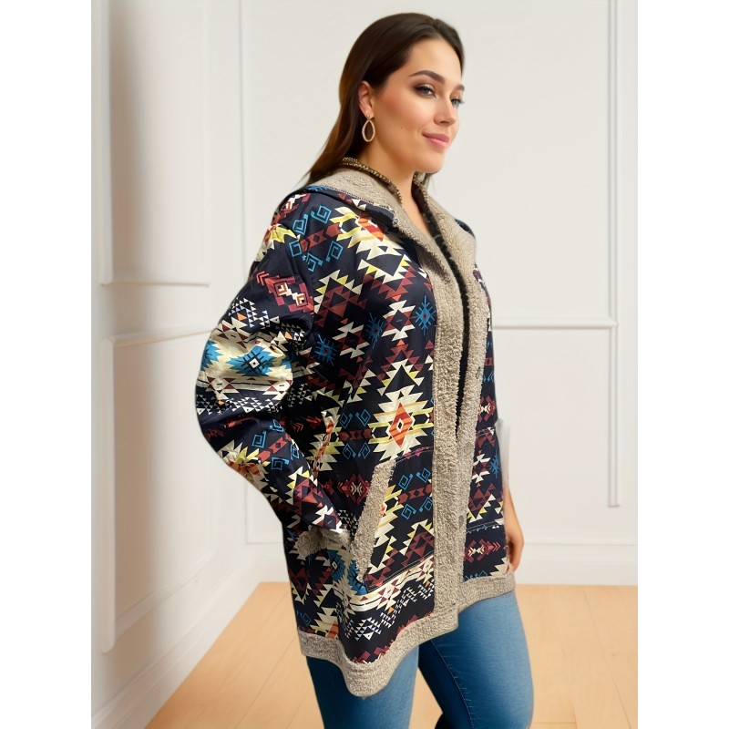 geo print button front jacket casual long sleeve hooded jacket with pockets for fall winter womens clothing details 0