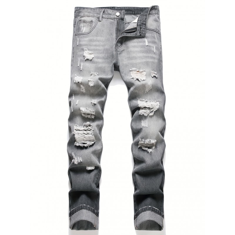 Men's Regular Ripped Jeans, Casual Street Style Distressed Denim Pants