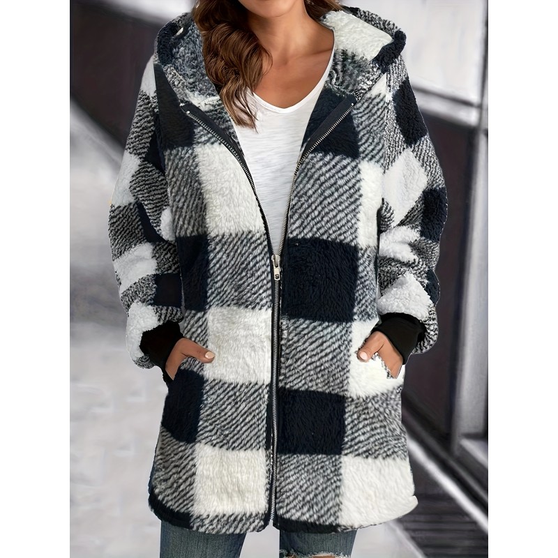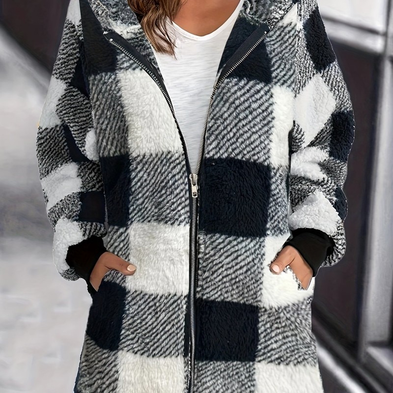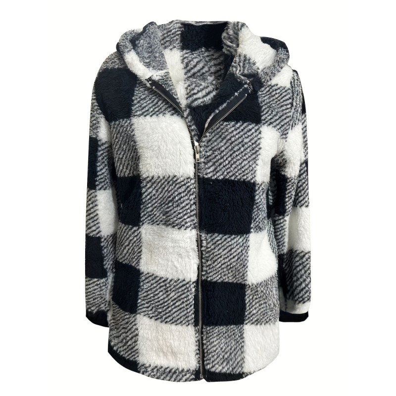 Plaid Print Hooded Jacket, Casual Long Sleeve Warm Zip Up Outerwear, Women's Clothing